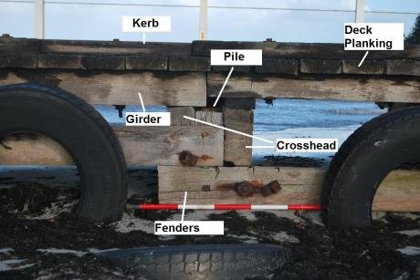 On the first day we set out, keen and believing we were completely prepared to record the features and structure of the 296m (exactly) long jetty. It might take us a while and we knew we would be facing deck planking, iron train tracks, bolts and pylons (at least). However we soon realised that we only vaguely knew terms for different parts on the jetty, in fact none of us knew the difference between a pile and a pylon. Oh and what is the name of those large beams attached to the top of them? They could be crossheads, as Wendy’s diagram suggested, or halfcaps….maybe. Someone, I think it was me, was throwing around the term crossbeams, which I probably made up…