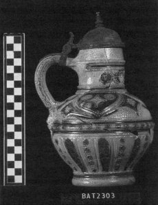 Westerwald ware jug from the Batavia – notice scale placed in plane of outline, identification tag near frame, and black background to contrast (Image: Green (2004) Figure 12.5)