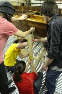 Figure 3: Michael, Caitlin, Maddy and Matt using a joggle stick to record the position of a planking edge. (M. Polzer 20 September 2012).