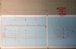 Figure 8: Caitlin’s lines drawing of Noctoo showing sheer plan (bottom left), half-breadth plan (top left) and body plan (bottom right). (W. van Duivenvoorde 25 September 2012).