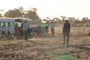 Trudging back and forth across endless metres of the bare, sun-baked, Redbanks paddock, hunters scour the ground for treasures scattered across its surface to be flagged. Others stand by their tools and instruments retrieving the treasures already identified. As the hours pass by the hunters continue their search for the lost Seven Stars Hotel, recording every action and discovery to add to their treasure maps, in the hopes that they will be guided towards their prize, all the while being worn down by the unrelenting sun and flies. Finally as the sun begins to set the hunters scramble to return to their camp, eager to escape the patch of dirt where they have toiled since the early hours of the morning.